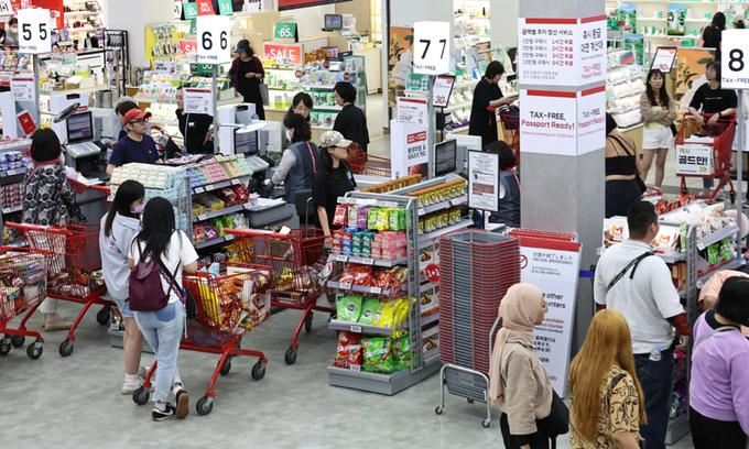 4일 서울 시내 한 대형마트에서 손님들이 계산대에 줄을 서 있다. 뉴시스