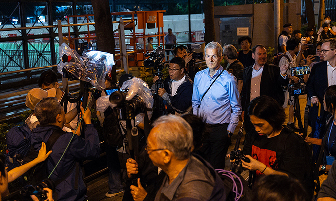 중국 톈안먼 민주화 시위 35주년 기념일인 4일 저녁 홍콩 주재 유럽연합(EU) 사무소 부대표와 독일과 네덜란드 총영사 등이 시민들과 취재진에 둘러싸여 당국이 추모집회 등을 금지한 빅토리아 파크를 보란 듯이 걷고 있다. 빅토리아 파크는 매년 톈안먼 시위 희생자 추모 촛불 집회가 열렸던 곳이다. 하지만 중국 정부가 홍콩국가보안법을 제정한 후 홍콩 당국은 해당 행사를 불허하고 있다.