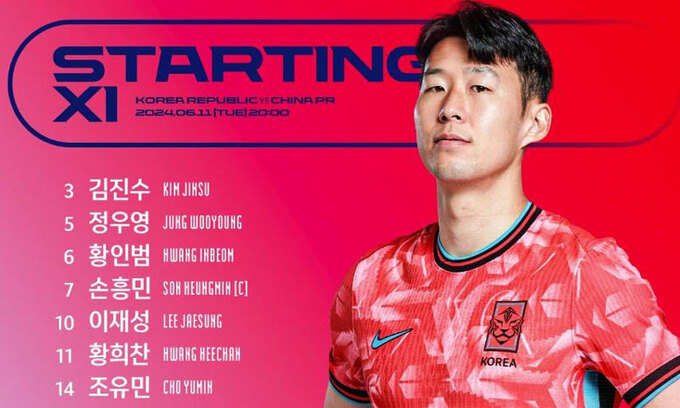 11일 김도훈 임시 감독이 이끄는 한국 축구 대표팀과 중국의 2026 국제축구연맹(FIFA) 북중미 월드컵 아시아 2차 예선 C조 6차전을 앞두고 발표된 선발 출전 선수 명단에 손흥민, 황희찬(울버햄프턴), 이강인(파리 생제르맹), 이재성(마인츠) 등이 이름을 올렸다.