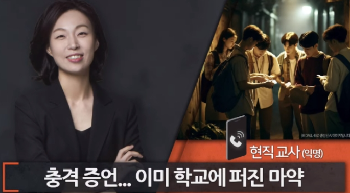 이에 교사는 인터뷰에서 “아이들은 절대 마약이라고 표현하지 않는다”며 “은어를 사용하거나 실제로 다이어트 약이라고 홍보하면서 값싼 중국산 합성 마약을 사회관계망서비스(SNS) 메시지로 접근한다”고 설명했다. 이어 “그 학생 본인도 환각성 있는 마약이라는 것을 알고는 있지만 혼날 테니까 끝까지 다이어트 약이라고 말한다”라고 전했다.