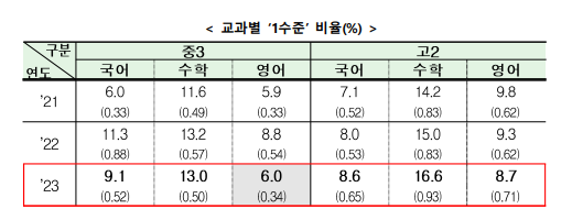고2 국어 과목의 기초미달 비율 역시 2018년(3.4%)부터 2019년(4.0%), 2020년(6.8%), 2021년(7.1%), 2022년(8.0%)에 이어 작년까지 5년 연속 커졌다. 수치 자체도 2017년 이후 최고 수준을 찍었다.