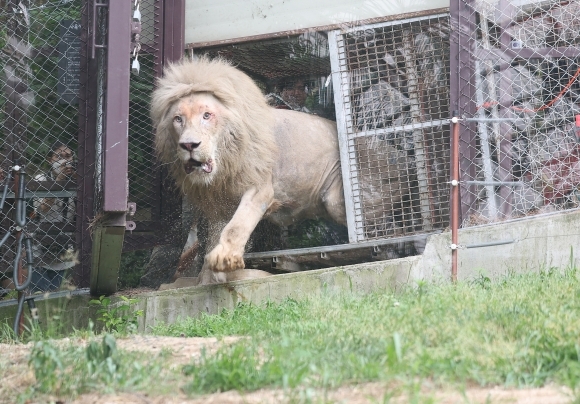 17일 오후 대구 수성구의 폐업한 실내동물원에 방치됐던 백사자 한 쌍이 150평(486㎡) 규모의 달성군 네이처파크 실외 방사장으로 이사했다. 이 백사자는 태어난 지 1년 만에 지하 실내 사육장에 갇혀 지냈다.