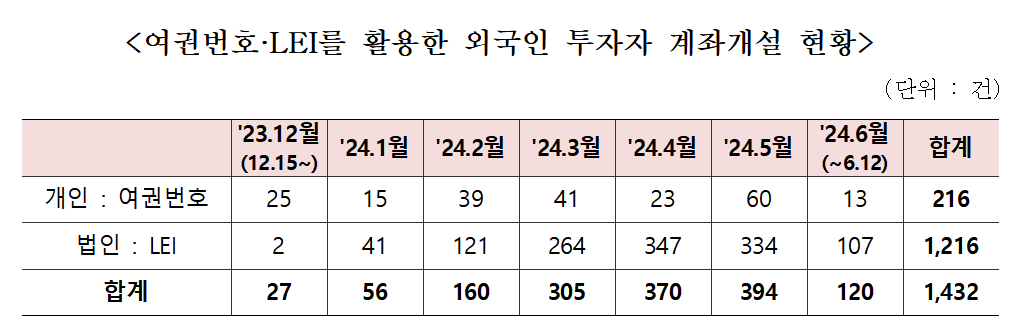 21일 금융위원회에 따르면 외국인 투자자 등록제가 폐지된 지난해 12월15일부터 지난 12일까지 법인 국제 고유번호(LEI) 및 여권을 활용한 개인 외국인 투자자의 계좌개설은 1432건으로 집계됐다. 36개 증권사·은행을 통해 법인 1216개, 개인 216개 계좌가 각각 개설됐다.