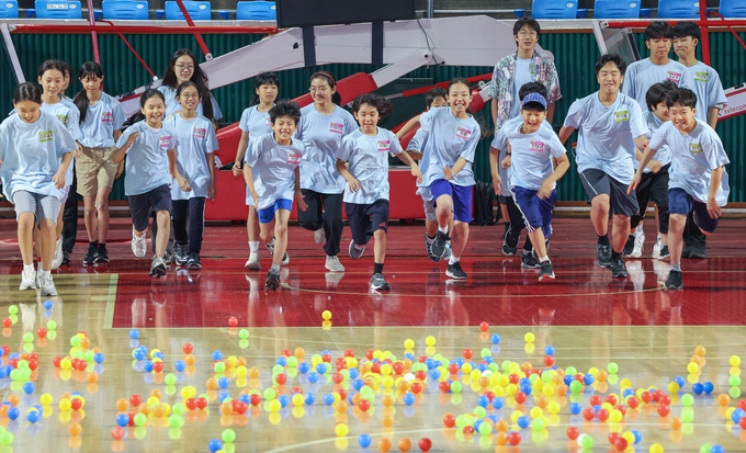 24일 서울 송파구 잠실학생체육관에서 열린 제1회 학교 밖 청소년 '친구랑' 체육대회에서 청소년들이 바구니 농구, 2인 3각을 하고 있다. 학교 밖 청소년 체육대회는 총 150명 내외의 학교 밖 청소년과 보호자가 참석하여 바구니 농구, 줄다리기, 이어달리기 등 협동심과 단결력을 기르는 순위없는 체육대회이다.