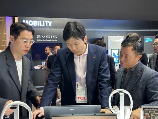 신동빈 롯데그룹 회장의 장남인 신유열 롯데지주 미래성장실장(가운데)이 지난 1월9일(현지 시각) 세계 최대 가전·정보기술(IT) 전시회 CES 2024에서 롯데정보통신 부스를 방문해 김동규 칼라버스 대표(왼쪽)와 고두영 롯데정보통신 대표의 설명을 듣고 있다. 연합뉴스