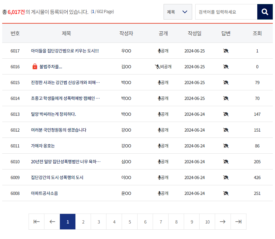 밀양시청 홈페이지에는 “아이들을 집단강간범으로 키우는 도시”, “밀양 박씨라는게 창피하다”, “집단강간의 도시 성폭행의 도시”, “진정한 사과는 강간범 신상공개와 피해자에게 시차원에서 즉각적이고도 충분한 금전적 보상”이라는 등 비난하는 글이 빗발쳤다.