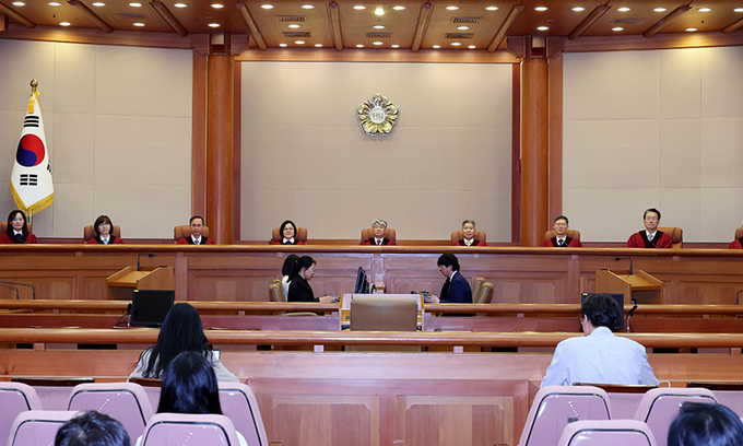 재판관 전원일치 의견 입력 : 2024-06-27 21:27:08 수정 : 2024-06-27 21:37:48 이제원 선임기자 구글 네이버 유튜브 27일 서울 종로구 헌법재판소 대심판정에서 이종석 헌법재판소장(가운데)과 헌법재판관들이 6월 심판사건 선고를 위해 자리하고 있다. 이날 헌재는 친족상도례를 규정한 형법 328조 1항에 대한 위헌 확인 소송 4건에 대해 재판관 전원일치 의견으로 헌법불합치를 결정했다. 이제원 기자 Copyright ⓒ 세계일보. 무단 전재 및 재배포 금지 세계일보 이제원