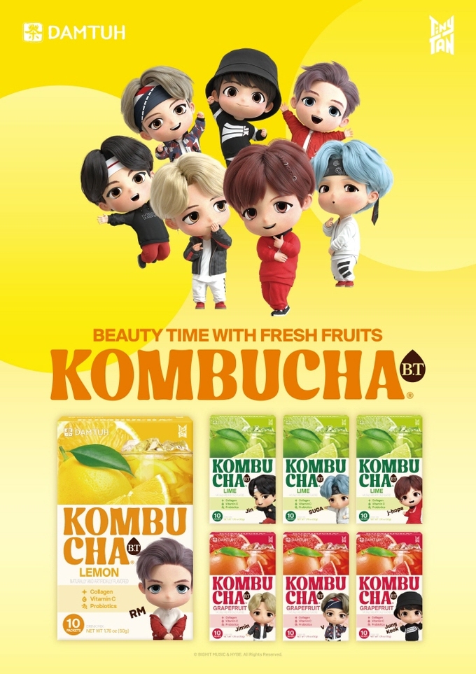 콤부차는 몇 해 전부터 해외 유명 인사들이 섭취하면서 주목을 받게 되었고, 이번에 출시되는 콤부차BT는 방탄소년단의 일곱 멤버를 귀엽게 형상화한 캐릭터인 ‘타이니탄’을 사용해 디자인해 눈길을 끈다.