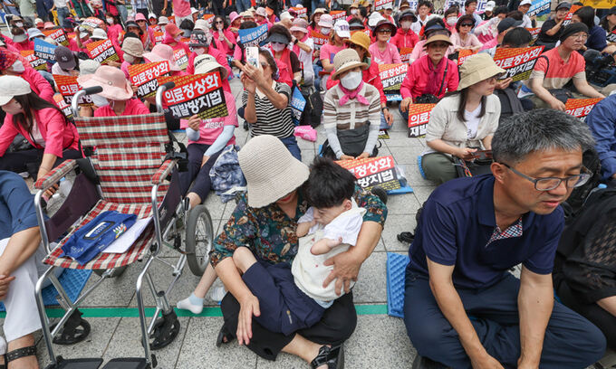 이날 보신각 앞에서 베이지색 모자를 쓰고 발언대에 오른 김정애(68)씨는 “아프게 태어난 하은이는 의사 선생님의 도움으로 위험한 고비를 넘기며 살았다”며 “하은이는 앞으로도 의사 선생님의 도움이 절실히 필요하다”고 호소했다. 김씨의 딸 박하은(23)씨는 발달장애와 사지기형 등을 동반한 ‘코넬리아드랑게 증후군’이라는 선천성 희귀질환을 앓고 있다. 최근 김씨는 의료계가 집단휴진을 선언하자 사태 해결을 촉구하는 간절한 마음에 삭발까지 했다. 김씨는 임현택 대한의사협회(의협) 회장과 한덕수 국무총리를 만나 “끝까지 대화하겠다”는 약속도 받았지만, 달라지는 건 없었다.