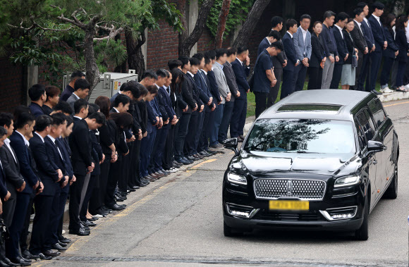 바깥에는 은행 동료 100여명이 도열했다. 이들은 검은색 옷을 입고 고개를 숙인 채 고인의 명복을 빌며 장지로 향하는 운구차의 출발을 지켜봤다. 이들은 출근길에 들렀거나 아예 휴가를 내 발인식에 참석했다.