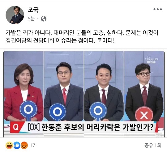 조 전 대표는 11일 자신의 SNS에 종합편성채널 TV조선의 국민의힘 당 대표 후보 토론회로 보이는 이미지와 함께 “가발은 죄가 아니다, 대머리인 분들의 고충은 심하다”는 글을 올렸다.