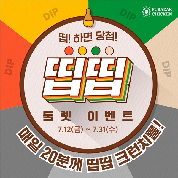 ‘띱띱 룰렛 이벤트’는 7월 12일부터 31일까지 진행되며, 푸라닭 치킨 전용 앱에서 이벤트 배너를 클릭하면 참여할 수 있다.