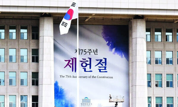 지난해 7월 서울 여의도 국회 본청에 제75주년 제헌절을 알리는 초대형 현수막이 내걸리고 있다. 연합뉴스