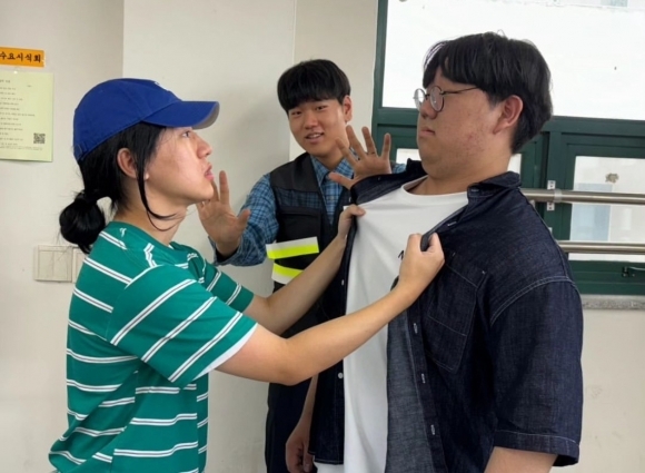 이재용 회장 분장도 눈에 띈다. 지난해 12월 윤석열 대통령이 주요 그룹 총수를 대동하고 부산 전통시장을 방문했을 때 이 회장이 카메라를 향해 ‘쉿’ 포즈를 한 모습을 따라 했다.