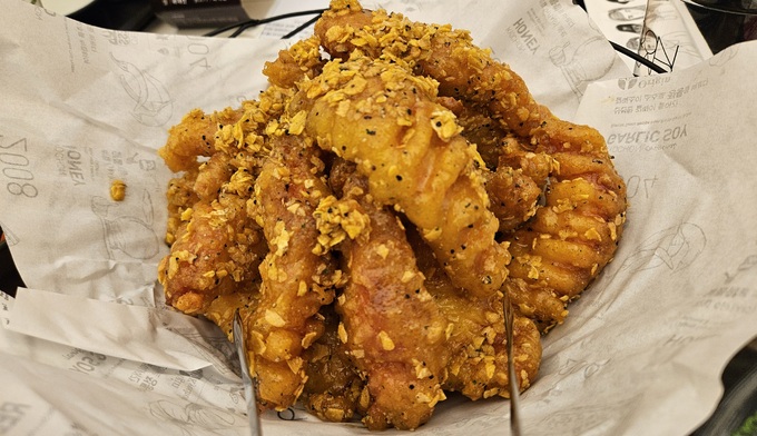 맛은 어떨까. 교촌옥수수의 특징은 크게 ▲진짜 옥수수 ▲100% 통안심 ▲떡볶이와의 궁합이 꼽힌다. 교촌옥수수는 아카시아꿀과 옥수수, 무염버터로 만든 특제 소스로 옥수수의 진한 단맛을 구현했다. 특히 시즈닝이 아닌 진짜 옥수수로 만든 ‘리얼 옥수수 플레이크’를 치킨 표면에 버무려 달콤하면서도 바삭한 특유의 식감을 최대한 살렸다. 진한 옥수수맛을 위해 먼저 튀겨낸 치킨에 소스를 한번 버무리고, 옥수수 플레이크로 또 한 번 버무리는 등 총 2번의 텀블링 과정을 거쳐 치킨에 소스를 입혔다.