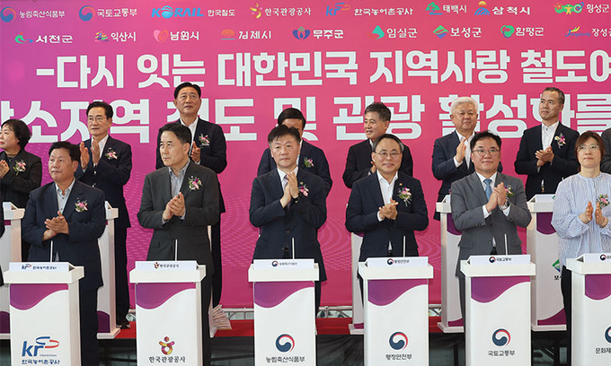 지난 16일 서울역에서 열린 인구감소지역 철도 및 관광 활성화를 위한 업무협약 행사에서 참석자들이 기념 촬영을 하고 있다. 연합뉴스