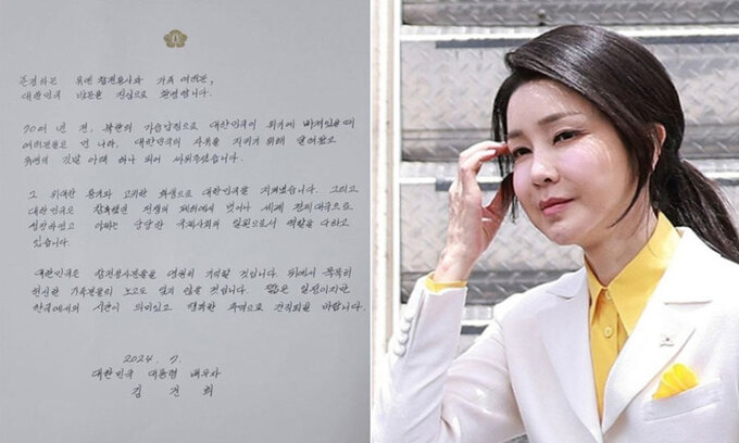 김 여사는 “대한민국은 참전용사분들을 영원히 기억할 것이고, 뒤에서 묵묵히 헌신한 가족분들의 노고도 잊지 않을 것”이라며 “한국에서의 시간이 의미 있고 행복한 추억으로 간직되길 바란다”고 덧붙였다. 참전용사와 유가족에게는 김 여사의 한글 손 편지와 함께 각 나라 언어로 번역한 편지가 전달된다고 보훈부는 전했다. 보훈부는 유엔군 참전의 날(7월 27일)을 맞아 19개국 유엔 참전용사와 유가족 등 67명을 한국으로 초청했다. 25일 방한한 이들은 판문점, 전쟁기념관, 부산 유엔기념공원 등을 방문했으며 30일 출국한다.
