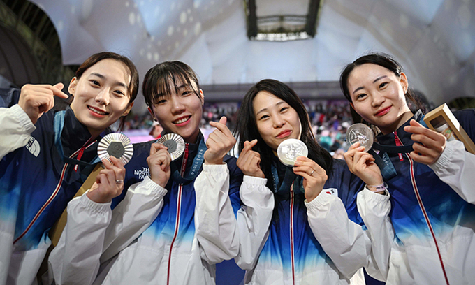‘뉴 어펜져스(어벤져스+펜싱)’는 여자 펜싱에도 빛났다. 여자 펜싱 사브르 대표팀이 사상 첫 은메달을 목에 걸며 도쿄 대회 때의 성과를 뛰어넘었다. 윤지수, 전하영, 최세빈, 전은혜로 구성된 대표팀은 3일(현지시간) 프랑스 파리 그랑팔레에서 열린 여자 펜싱 사브르 단체전 결승서 우크라이나에 42-45로 아쉽게 패배하면서 은메달에 만족했다.