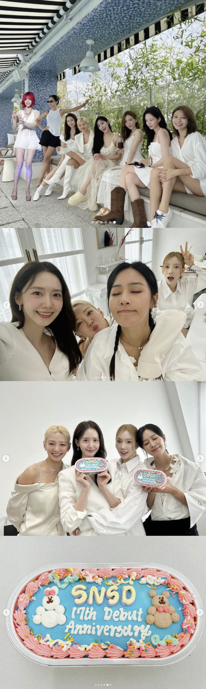 소녀시대 멤버들은 5일 각자의 사회관계망서비스(SNS)에 단체 사진을 게재하며 17주년을 자축했다. 멤버들은 의상을 흰색으로 통일해 데뷔 때와 다름없는 맑은 매력을 자랑했다. 8명의 멤버 가운데 써니는 일정 상 미국에 있는 관계로 함께하지 못한 것으로 알려졌다.