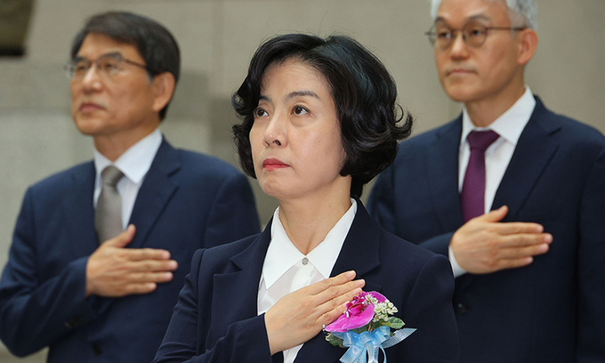 이숙연 신임 대법관이 6일 서울 서초구 대법원에서 열린 이숙연 신임 대법관 취임식에서 국민의례를 하고 있다. 연합뉴스