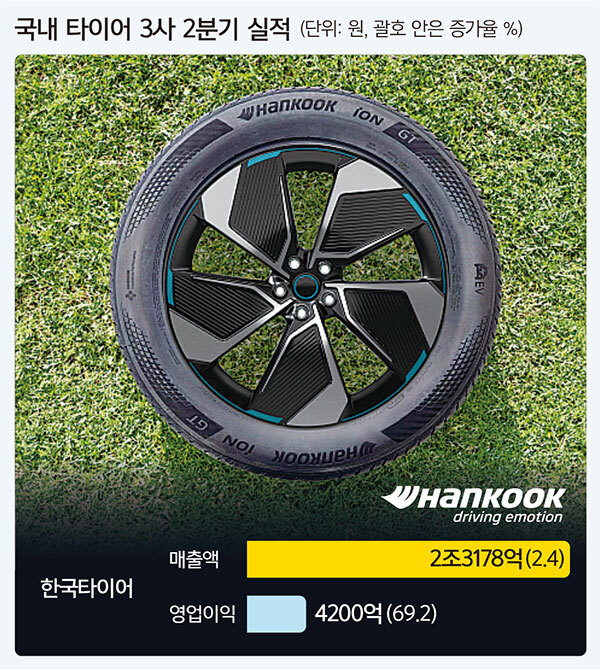 한국타이어는 2분기 매출액이 2조3178억원, 영업이익이 4200억원이라고 밝혔다. 전년 동기 대비 각각 2.4%, 69.2% 증가했다.