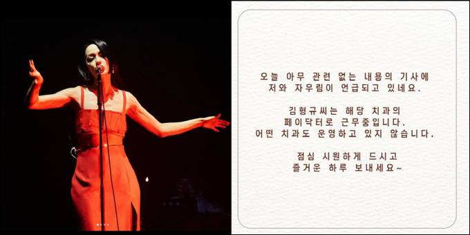 이어 “김형규 씨는 해당 치과의 페이닥터로 근무 중이다. 어떤 치과도 운영하고 있지 않다”며 “점심 시원하게 드시고 즐거운 하루 보내셔라”고 오해를 해명했다.
