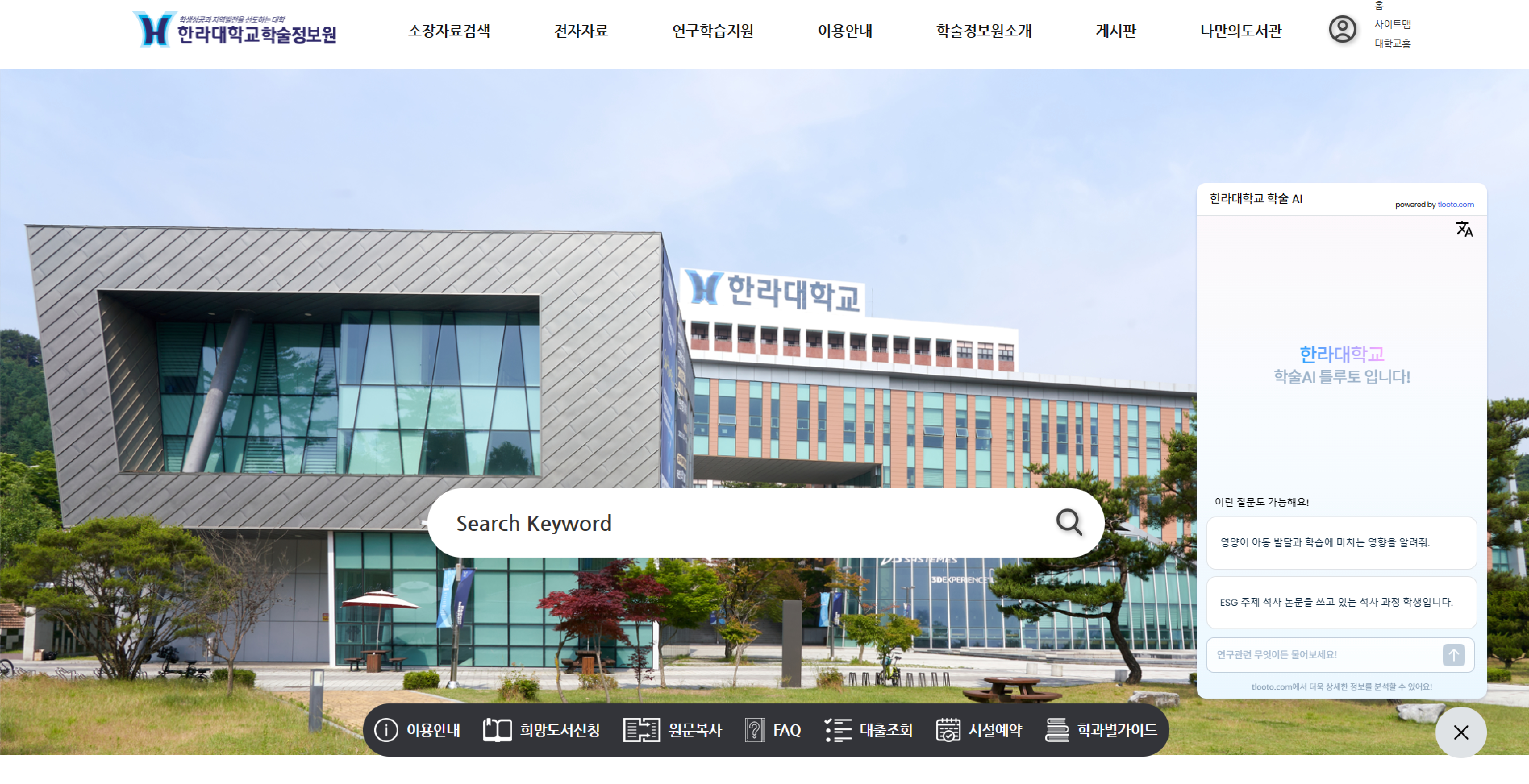 한라대학교는 글로벌 리서치테크(Research Tech) 기업인 tlooto(틀루토)와의 협력을 통해 도서관 시스템에 최신 AI Copilot(AI 코파일럿) 기능을 도입한다고 발표했다. 이번 개편을 통해 한라대학교 도서관 웹사이트에는 틀루토의 생성형 AI 챗봇이 설치되어, 이용자들에게 실시간으로 신뢰성 높은 학술 정보를 제공할 예정이다.