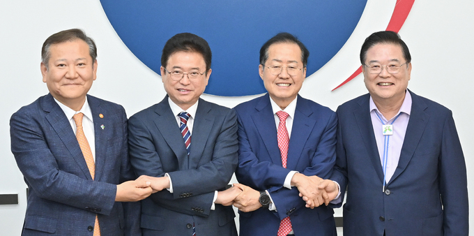 이상민(왼쪽부터) 행정안전부 장관, 이철우 경북도지사,홍준표 대구시장, 우동기 지방시대위원장이 대구경북 통합 관계기관 간담회에서 기념촬영을 하고 있다. 대구시 제공