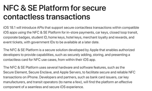 IOS 18.1가 정식 공개되면 이용자들은 아이폰에서 애플페이 외 다른 간편 결제 서비스로 대중교통 요금 지불, 직장 출입증, 집과 자동차 키 등 NFC를 활용한 기능들을 사용할 수 있게 된다. 기술적으로는 '삼성페이'도 아이폰에서 이용할 수 있는 것이다.