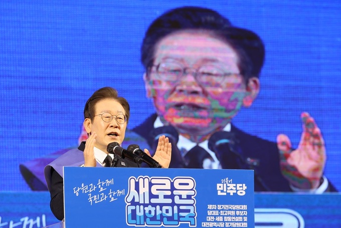 이재명 더불어민주당 당 대표 후보가 지난 11일 오후 대전 서구 배재대학교에서 열린 더불어민주당 전당대회 대전·세종 합동연설회에서 기조연설을 하고 있다. 대전=뉴시스