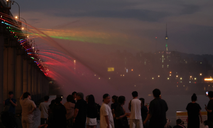 반포대교 아래에서 시민들이 분수를 보고 있다. 연합뉴스