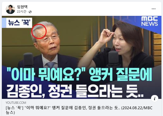 임 회장은 22일 오후 페이스북에 김 전 위원장이 낙상 사고 후 응급실을 찾아 헤멘 사연이 담긴 뉴스를 공유해 상단에 고정했다. 해당 뉴스 이미지에는 ‘이마 뭐예요? 앵커 질문에 김종인, 정권 들으라는 듯…’이라는 문구가 담겼다.