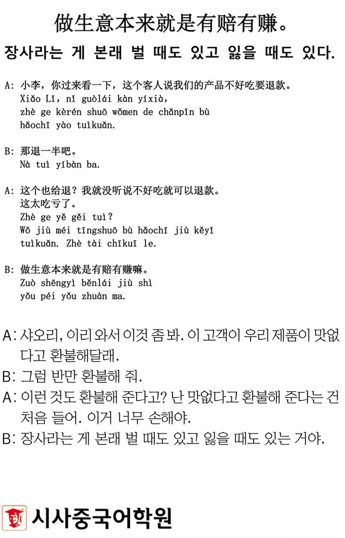 [시사중국어학원의 리얼 중국어 회화] 장사라는 게 본래 벌 때도 있고 잃을 때도 있다. 입력 : 2024-08-27 18:21:59 수정 : 2024-08-27 18:21:58 구글 네이버 유튜브 Copyright ⓒ 세계일보. 무단 전재 및 재배포 금지 세계일보