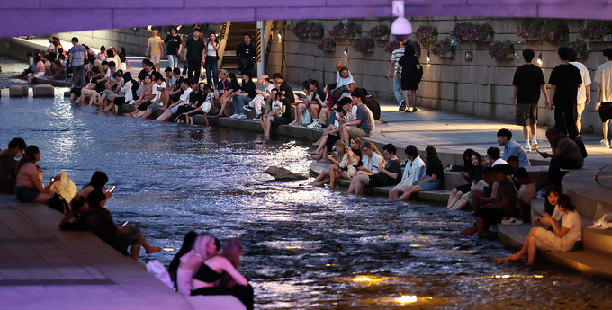 서울 청계천을 찾은 시민들이 지난 25일 물에 발을 담그고 있다. 뉴스1
