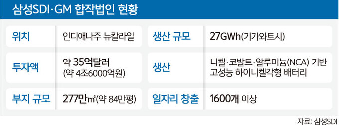 삼성SDI가 북미 현지에서 완성차업체와 합작 공장을 짓는 것은 스텔란티스에 이어 두 번째다. 이번 GM과의 합작법인 소재지는 인디애나주 뉴칼라일로 확정됐다. 부지 규모는 277만㎡(약 84만평)에 달한다. 또한 삼성SDI는 양사의 합작법인 설립으로 1600개 이상의 일자리를 창출, 지역 경제 활성화에 기여할 것으로 예상하고 있다.