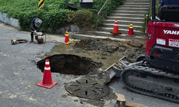 8월31일 오후 대구 동구 방촌동 금호강 제방 옆 도로에서 가로 50㎝, 세로 30㎝, 깊이 1.7m의 땅꺼짐(싱크홀)이 발생한 가운데 당국이 포클레인을 이용해 복구작업을 하고 있다. 8월29일 서울 서대문구 연희동 성산로에 이어 31일 대구 동구 금호강 제방 옆 도로, 같은 날 오후 4시 서울 종로구 종로5가역∼종로3가역 편도 3차선 도로 등 전국 도로 곳곳에서 땅꺼짐 및 도로침하 사고가 잇따르고 있다.