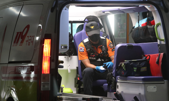 서울 시내의 한 대학병원 권역응급의료센터에서 구급대원이 휴식을 취하고 있다. 뉴스1