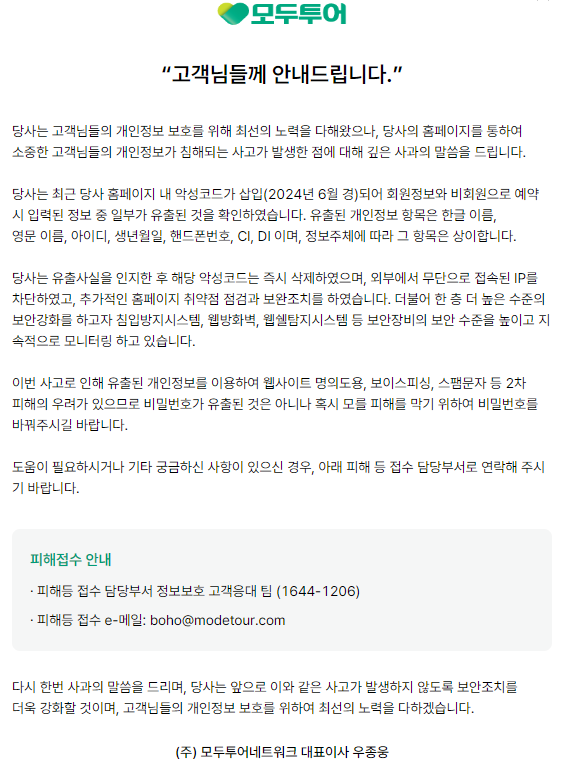모두투어는 최근 자사 홈페이지에서 발생한 개인정보 유출 사건에 대해 고객들에게 사과하며, 개인정보보호위원회에 신고했다고 밝혔다. 이 사건은 지난 6월경에 발생했으며, 회사는 그동안 유출 사실을 인지하지 못하다가 최근에서야 이를 확인했다.