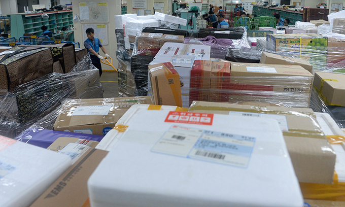 추석 명절을 앞두고 한 지방우정청에서 직원들이 추석 택배를 분류하며 분주하게 움직이고 있다. 뉴시스
