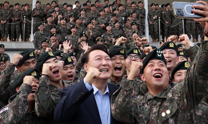 윤 대통령은 마지막으로 사단 사열대에서 500여 명의 장병들을 격려하고 기념 사진을 찍었다. 이날 행사에는 15사단 군악대에서 복무 중인 방탄소년단(BTS)의 리더 김남준 상병(RM)도 참석해 눈길을 끌었다. 최근 국가보훈부 캠페인에 1억 원을 기부해 화제가 된 김 상병은 윤 대통령과 악수를 하고 단체 사진을 함께 찍었다.