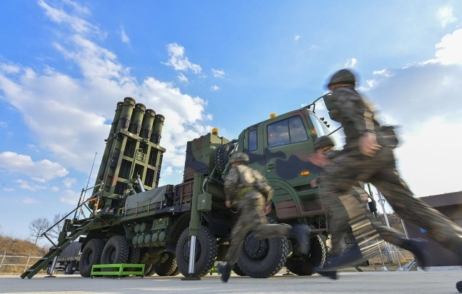 지난 3월 19일 경북 북부지역에 배치된 공군의 중거리 지대공유도무기 '천궁-Ⅱ' 포대 장병들이 발사대 작동 절차를 훈련하기 위해 뛰어가고 있다. 공군 제공.