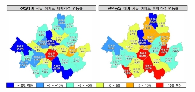 그러나 강서구는 21.9% 하락했으며, 종로구(-18.0%), 서초구(-11.5%), 도봉구(-8.4%), 서대문구(-6.8%), 영등포구(-6.5%) 등도 하락 폭이 큰 편이었다.