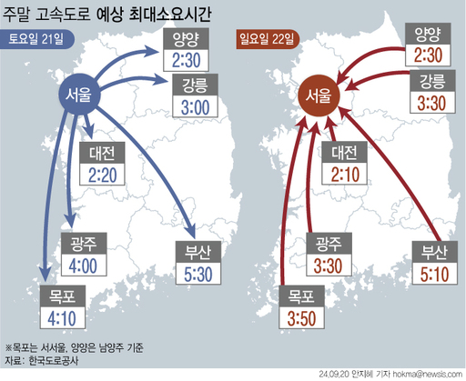 오전 10시 요금소 기준으로 승용차를 이용한 주요 도시 간 예상 소요시간은 하행선 ▲서울~부산 5시간10분 ▲서울~대구 4시간10분 ▲서울~광주 3시간50분 ▲서울~대전 2시간10분 ▲서울~강릉 3시간 ▲서울~울산 4시간50분 ▲서서울~목포 4시간이다.