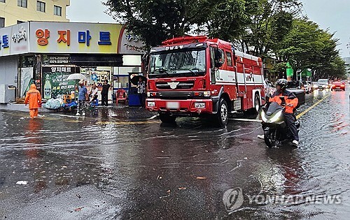(목포=연합뉴스) 21일 오후 전남 목포시 한 도로가 침수돼 소방 당국이 배수 작업을 하고 있다. 2024.9.21 [전남소방본부 제공. 재판매 및 DB 금지] daum@yna.co.kr