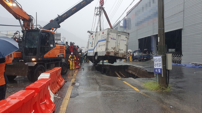특히 오전 8시25분께 사상구의 한 도로에서 가로 10m, 세로 5m, 깊이 8m 규모의 땅꺼짐(싱크홀)이 발생했다. 이 땅꺼짐으로 소방 배수지원차와 5t 트럭이 빠졌다.