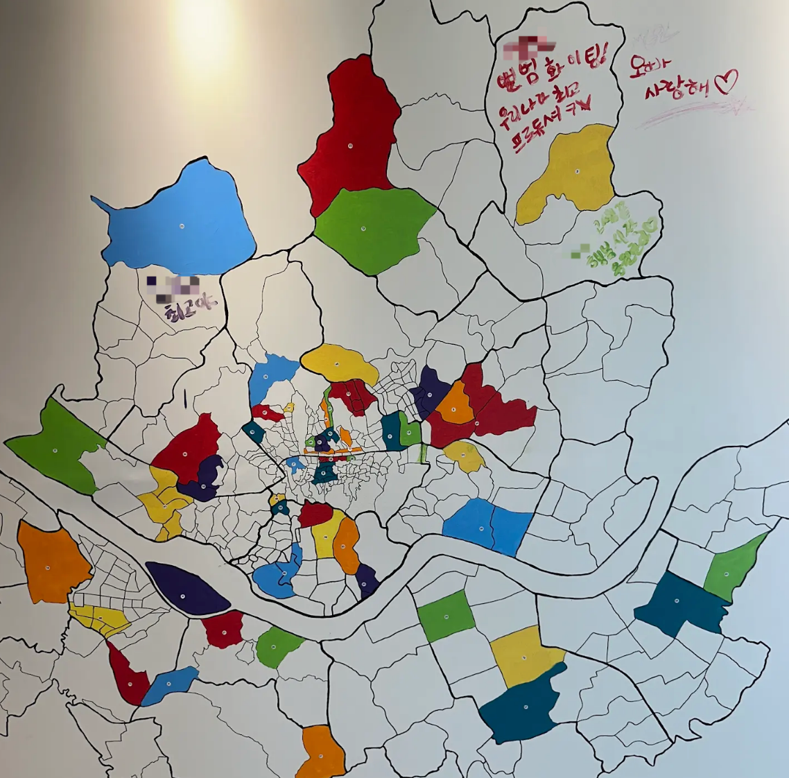 그늑튼은 구독자 22만명을 보유한 유튜브 채널 ‘아이고바트(iGoBart)’에서 2022년 9월부터 서울의 각 동(洞)을 탐방하는 ‘웰컴 투 마이 동’ 시리즈를 올리고 있다. 전시 중이던 서울 지도는 그가 직접 방문한 동을 색칠한 것이다.