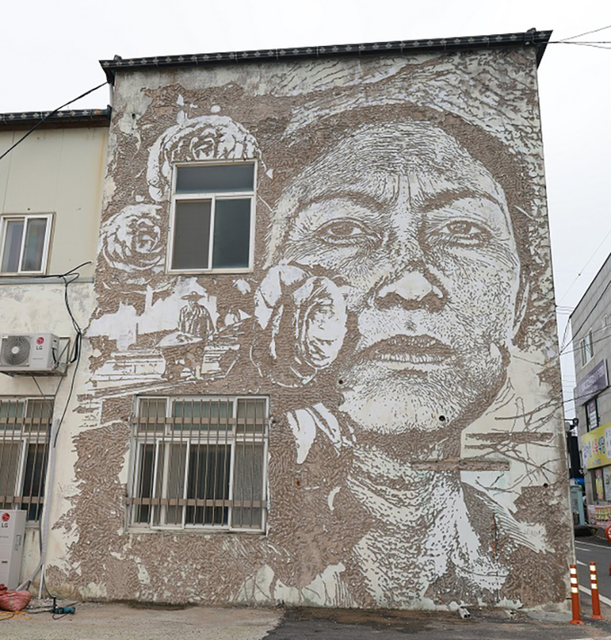 24일 신안군에 따르면 낙서마을에 새롭게 등장한 그라피티는 포르투갈 출신의 그라피티 작가 빌스(Vhils) 작품이다. 빌스는 압해농협 본관 후면에 드릴을 활용해 단차(段差·높낮이의 차)를 만들어 음영을 주는 방식으로 가로 8m, 세로 10m의 초대형 작품을 22일 완성했다. 작품은 ‘염전과 노동자의 얼굴’을 주제로 익명의 여성 노동자의 노고를 섬세하게 그려냈다. 노동자 얼굴 주변에는 압해도를 대표하는 애기동백꽃이 표현돼 있다. 빌스는 “이번 작품은 700번째로 특별하고 의미 있어 작품 하단 좌우로 사인을 두 개를 남겼다”고 소감을 남겼다.