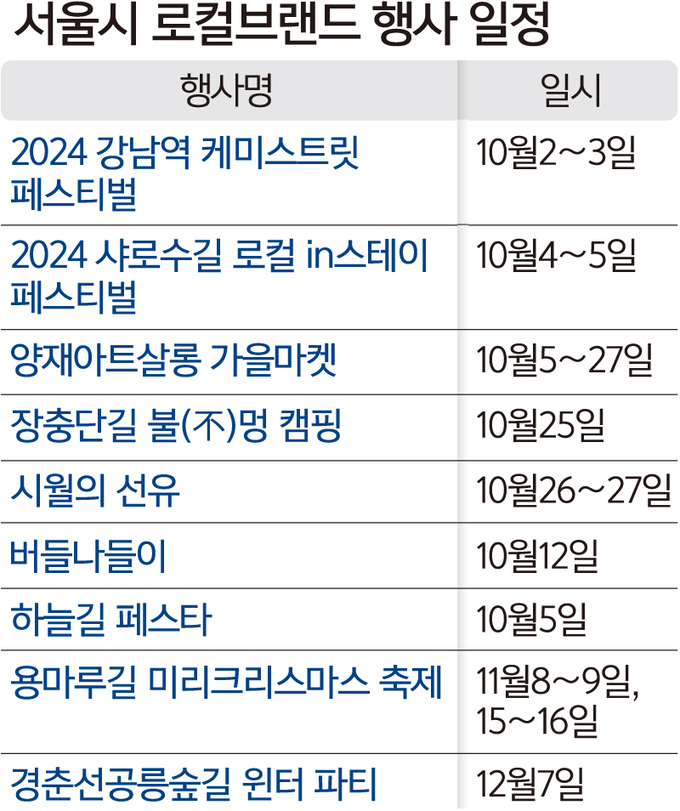 ‘2024 강남역케미스트릿 페스티벌’은 이날부터 3일까지 강남역 9번 출구 인근 강남역케미스트릿에서 열린다. 맛·멋·미 등 한류 문화를 체험할 수 있는 행사다. 서울대입구역 인근 샤로수길에선 4∼5일 ‘샤로수길 로컬in 스테이’가 개최된다. 지역 예술가들과 함께하는 DIY디퓨저 만들기, 플로리스트 클래스 등 체험 부스가 운영된다.
