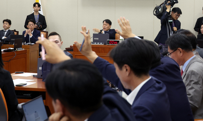 지난 9월 30일 서울 여의도 국회에서 열린 정무위원회 전체회의에서 여야 의원들이 손을 들고 국정감사 증인 및 참고인 채택 관련 의사진행 발언을 신청하고 있다. 뉴시스
