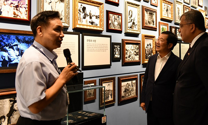 국군의날인 지난 1일 서울 용산 전쟁기념관을 방문한 빌랄 두르달르 튀르키예 국방부 차관(오른쪽)이 전쟁기념사업회 백승주 회장(가운데)과 함께 튀르키예군 등 유엔군 참전 관련 전시물을 살펴보고 있다. 전쟁기념사업회 제공